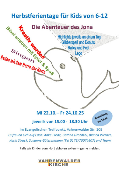 Das Kinderteam der Vahrenwalder Kirchengemeinde lädt alle Schulkinder an drei aufeinanderfolgenden Nachmittagen in der 2. Herbstferienwoche von 15.00—18.30 Uhr ein, die spannenden Abenteuer des Propheten Jona mitzuerleben und dabei jede Menge Spaß zu haben. Jeden Tag gibt es neben der Erzählung, der Austauschzeit in Kleingruppen, Spielen, Liedern und einem Gebet auch eine Zeit, in der die Kinder kreativ werden können: Jeweils an einem Tag mit Lego, mit Farben bzw Glibber und in einer Festvorbereitung.